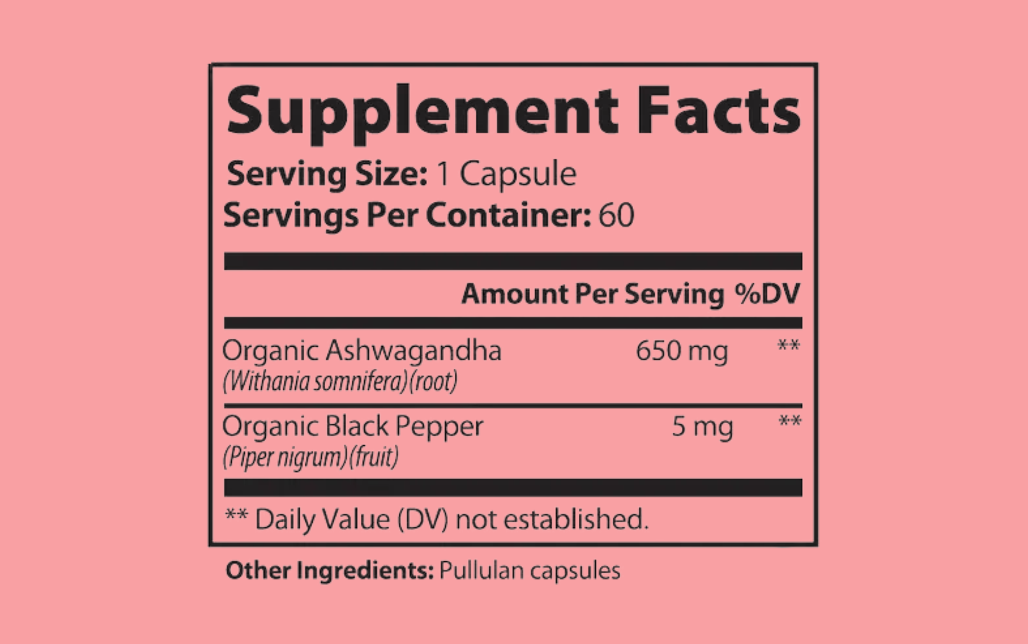 Organic Ashwagandha (Withania somnifera)(root), Organic Black Pepper (Piper nigrum)(fruit), pullulan capsules.