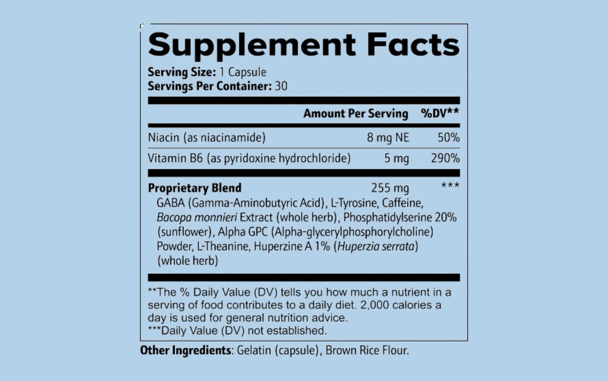 This cognitive enhancement supplement is designed to support normal brain functions through a blend of natural compounds. It combines Niacin, Vitamin B6, GABA, L-Tyrosine, and other key ingredients like Bacopa monnieri and Huperzine A, aimed at promoting normal mental clarity, focus, and cognitive performance. Ideal for daily use, this supplement is dedicated to supporting your brain's health and enhancing cognitive functions using high-quality, natural ingredients, without artificial additives.